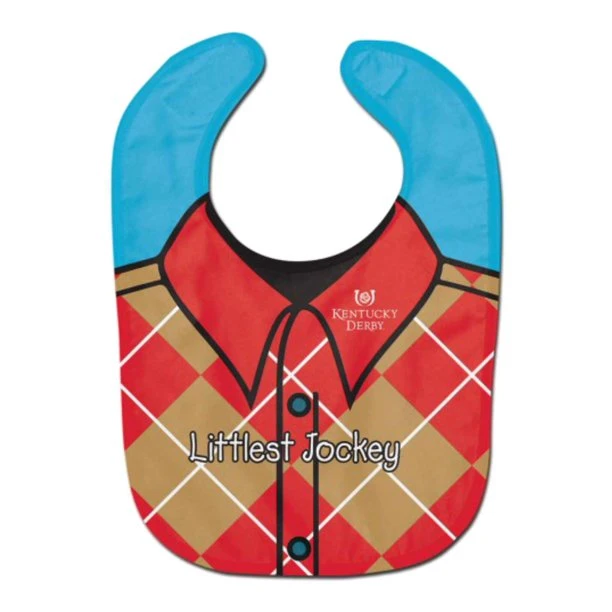 Featuring an official Kentucky Derby rose logo and printed “Littlest Jockey”, this baby bib is made of soft terry polyester and absorbent cotton terry back. Decorated with a fun, full-color jockey silk design. Finished with an adjustable baby soft hook and loop closure.
