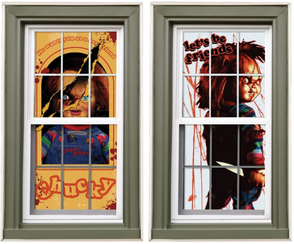 | Â Wanna play? These Chucky window silhouettes measure 33.5″ x 65″ (85cm x 165.1xm). Includes two window silhouettes (great for doorways too!)Â | ![]() |