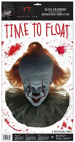 It Chapter 2 Pennywise Face Glass Grabber decoration looks great on glass and mirrors and will make a scary Halloween decoration. Pennywise Face will cling to most smooth surfaces without adhesives. It Chapter 2 Pennywise Face Glass Grabber measures 12.25″ W x 23.75″ H.