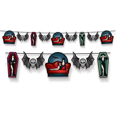 | Â Officially licensed Elviraâ„¢ streamer decoration. Measures 6 3/4″Â x 6′ | ![]() |
