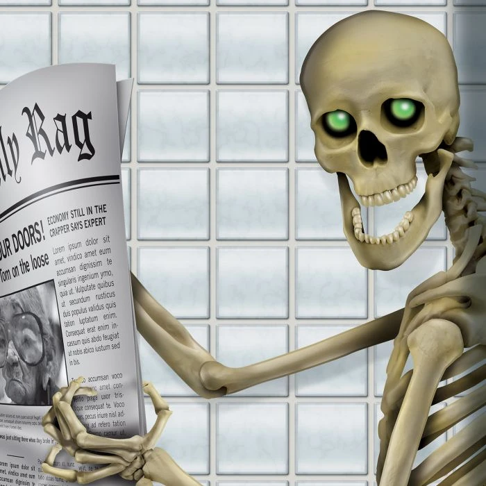 The Skeleton Restroom Door Cover measures 30 inches wide by 5 feet tall and can easily be hung up with tape on any door you wish.