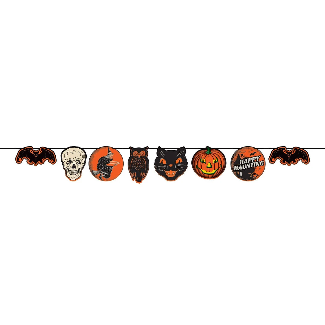 Take a trip down memory lane with the Halloween Jointed Streamer. Originally manufactured in 1960, this reproduction cardstock hanging decoration will bring a nostalgic and vintage feel to your seasonal decorations. Each streamer comes ready to hang; simply remove from the packaging and unfurl at each jointed eyelet. Measuring over six and a half feet, the attached characters include a jack-o-lantern, flying witch, hissing black cat, and sinister looking owl. The timeless color palette features green, orange, black and white, which coordinates well with more current decorations. One complete streamer per package.