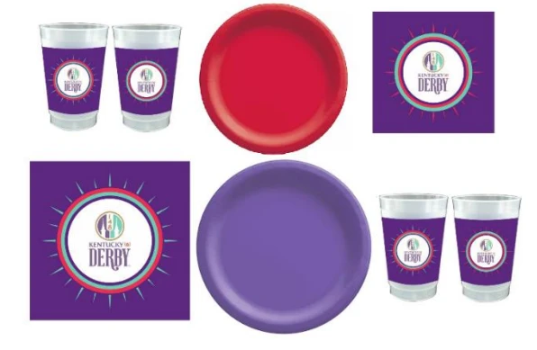 Includes:Â 1 pkg 7″ solid purple plates (8 per pkg), 1 pkg 9″ solid purple plates (8 per pkg), 1 pkg 148 logo beverage napkins (24 per pkg), 1 pkg 148 logo luncheon napkins (24 per pkg), 1 set 148 logo frosted cups (8 per pkg).Â