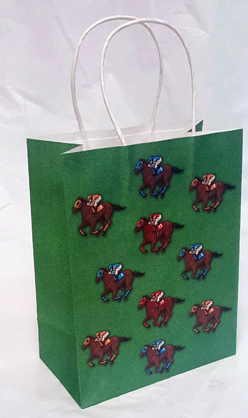 8″ wide x 4.5″ deep x 10″ high Bags. Versatile, inexpensive but oh so attractive to hold those special Derby gifts! High quality twisted handle shopping bags.