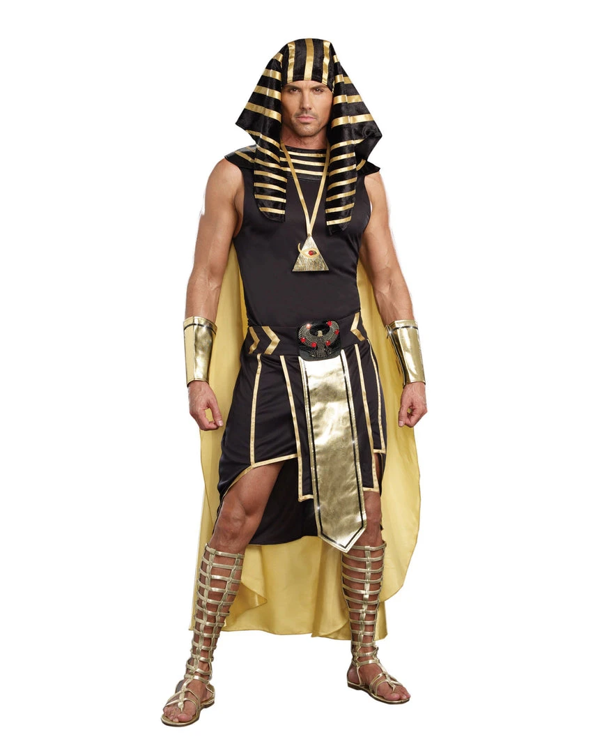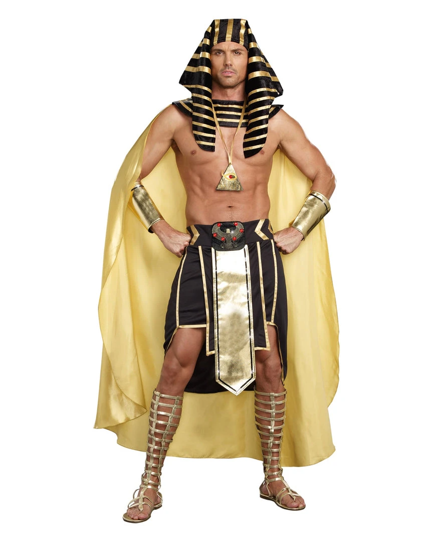 Reign your kingdom as a vision of desire in this versatile men’s costume featuring a detailed Egyptian collar with attached gold cape, sleeveless shirt, wrist gauntlets, Egyptian headpiece, Eye of Horus necklace and Shendyt skirt.