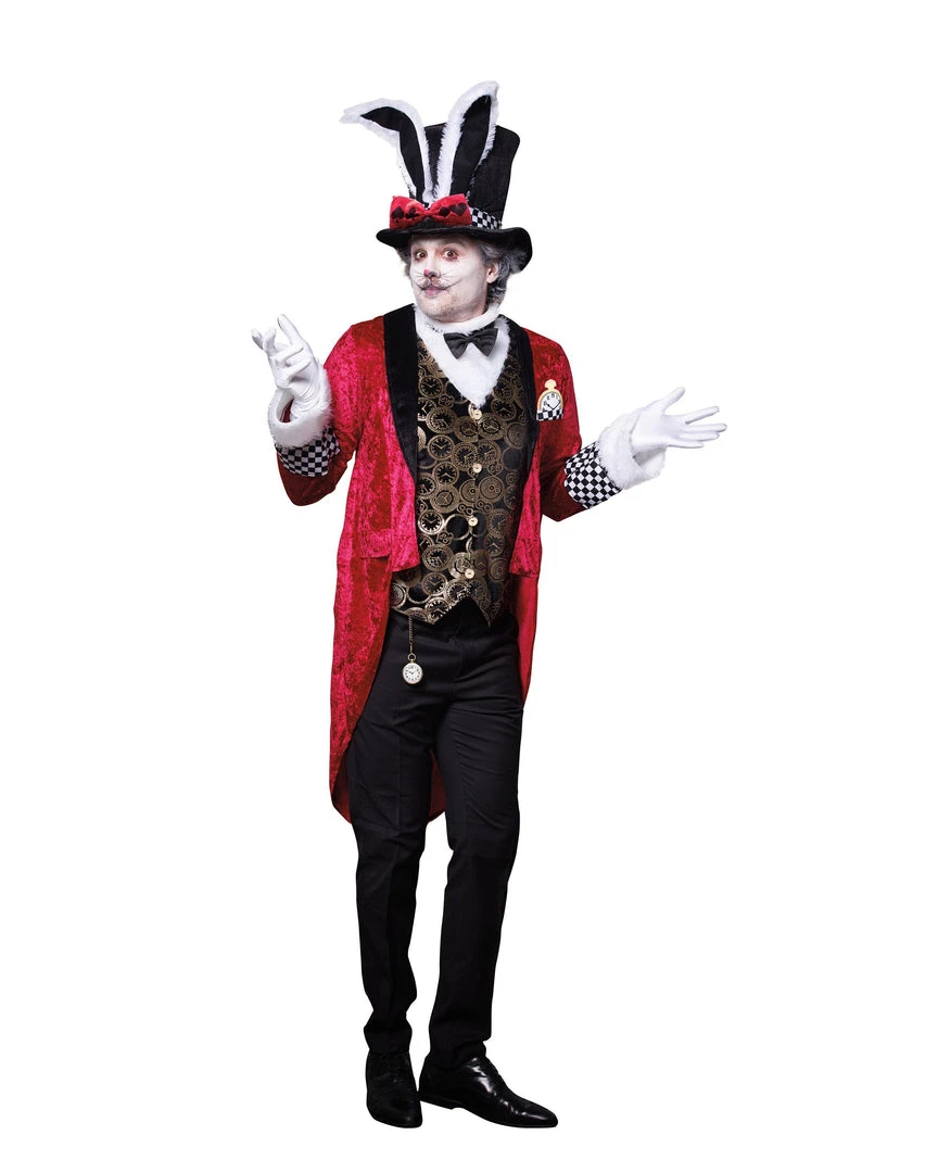 This men’s white rabbit costume features a red velvet jacket with pocket watch applique, black-and-white checkered cuffs, and black and gold clock-printed vest with attached faux-fur dickey and black satin bow tie.