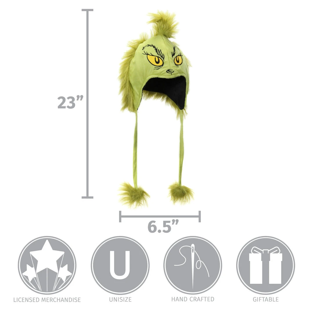 He’s a mean one, Mr. Grinch, but you’ll love him all the same when you wear this Dr. Seuss The Grinch Plush Hoodie Hat. Inspired by the beloved children’s book, this Laplander style hat features plush craftsmanship in fuzzy polyester in addition to faux fur details in beautiful Grinchy green. To make sure you’re completely recognizable as the iconic character, we’ve even embroidered the Grinch’s expression and bright yellow eyes on the front of the hat.Â
