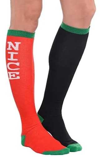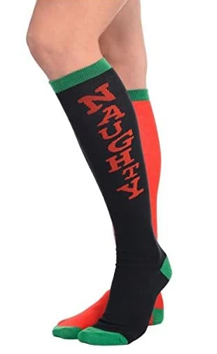 Naughty/Nice Socks. 70% acrylic, 28% polyester, 2% spandex. Machine wash, line dry. One size fits most.Â