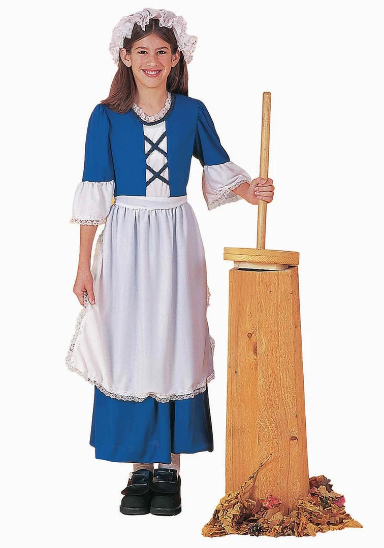 Not everyone wants to go back to the past and learn how hard it is to churn butter, but your girl is sure to have a better appreciation for Colonial times when she goes in this classic Colonial Girl costume. The base is a royal blue costume with an ankle length skirt. The top has three-quarter length sleeves with a white wide bell finish. The bodice has faux corset detailing and a lace edging around the neck. Finish it off with the lace-edged apron and traditional white hat and the look will be complete. The role will be all hers when she gets this costume for costume play or a historical recreation!
