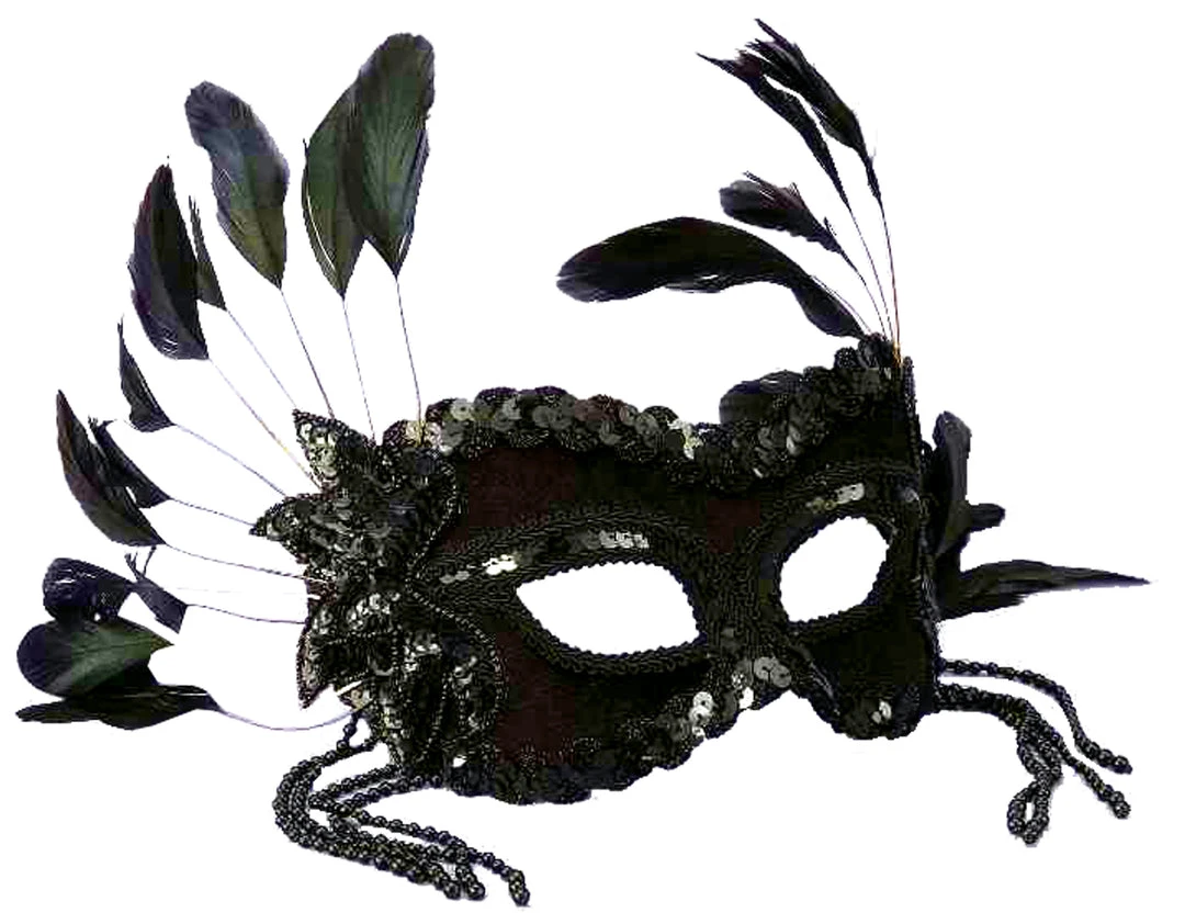 Beautifully crafted, this Velvet Venetian Colombina-style Mask features black beads and applique. Feathers in black accent either side of the mask. The soft, cloth covered headband provides a comfortable and secure fit while giving the wearer the ‘no-fuss’ option of raising or lowering the mask without removing it!