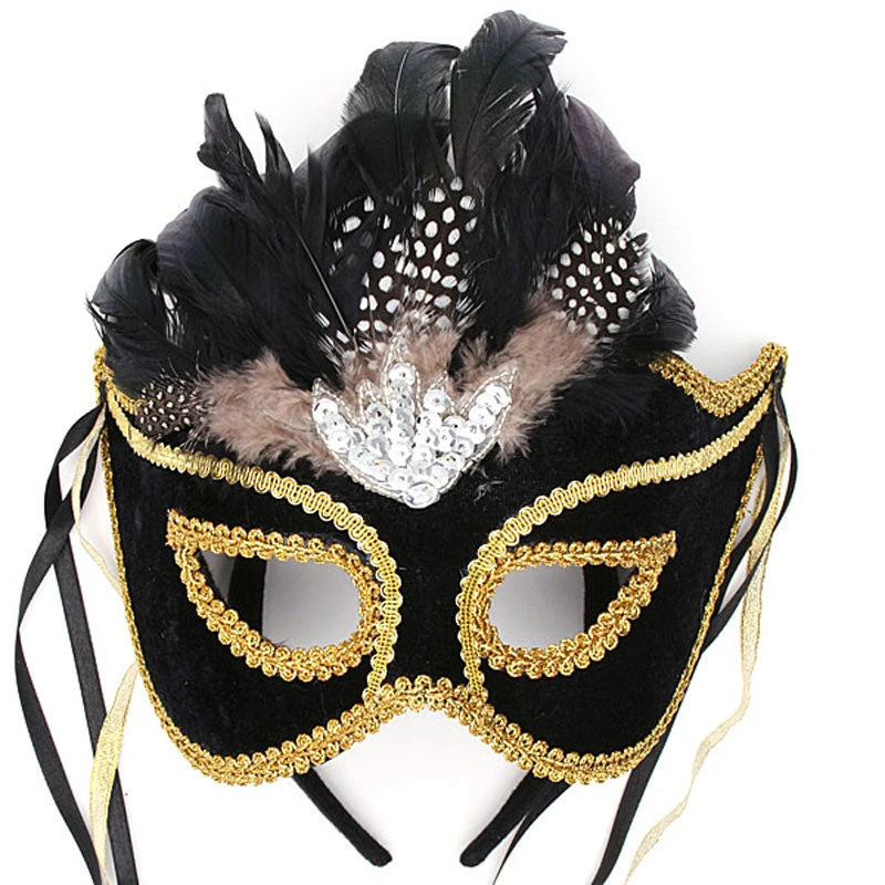 Beautifully crafted, this Velvet Venetian Colombina-style Mask features gold trim. Feathers in black, beige and polka-dotted accent the center of the mask. The soft, cloth covered headband provides a comfortable and secure fit while giving the wearer the ‘no-fuss’ option of raising or lowering the mask without removing it!