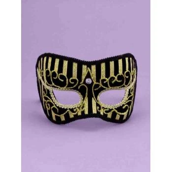 Beautifully crafted, this Venetian Colombino-style Mask features metallic gold and black stripes with black embroidered trim. The soft, cloth covered headband provides a comfortable and secure fit while giving the wearer the ‘no-fuss’ option of raising or lowering the mask without removing it!