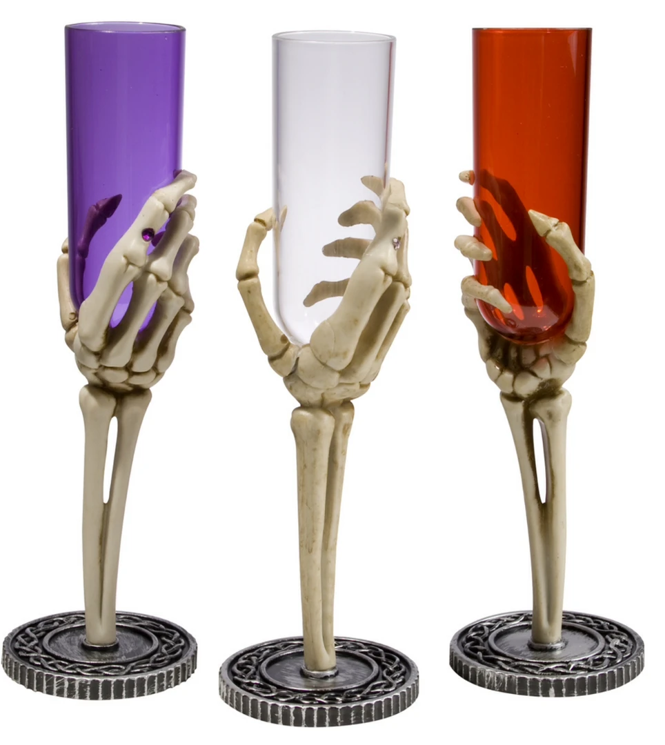 Scare up some chills with these Skeleton Hand Fluted Glasses. This plastic flute measures 9.75″ tall and adds a spooky touch to your table decor.  Now you can toast to that special occasion on All Hallow’s Eve with these gruesome goblets. Complete with a plastic skeleton hand base and plastic vial for your favorite beverage. These glasses are ideal for Halloween parties, themed weddings and other gothic events!