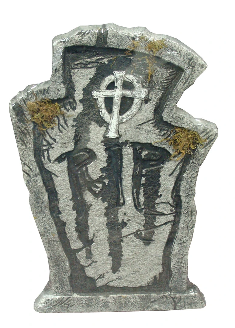 This creepy tilting tombstone comes with cross design, and RIP detail. The tombstone’s weathered look, and added moss, adds a realistic touch to any scene. Product includes two (2) ground stakes for easy display. Tombstone stands 22 inches tall. This prop does not light up.