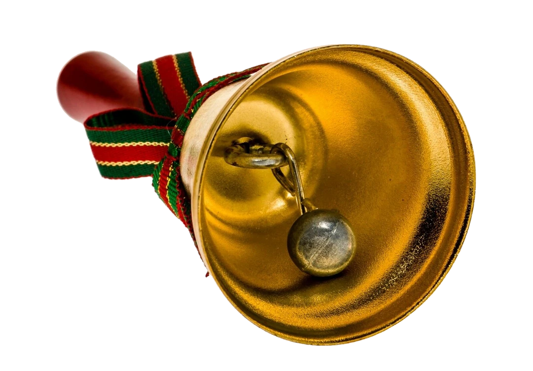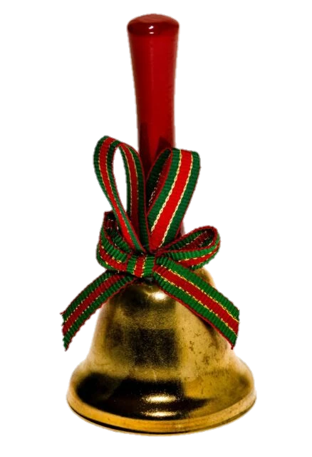 Old fashioned 5″ tall Gold Hand Bell with red wooden handle, ribbon for hanging and red/green bow with metallic gold accent. Â