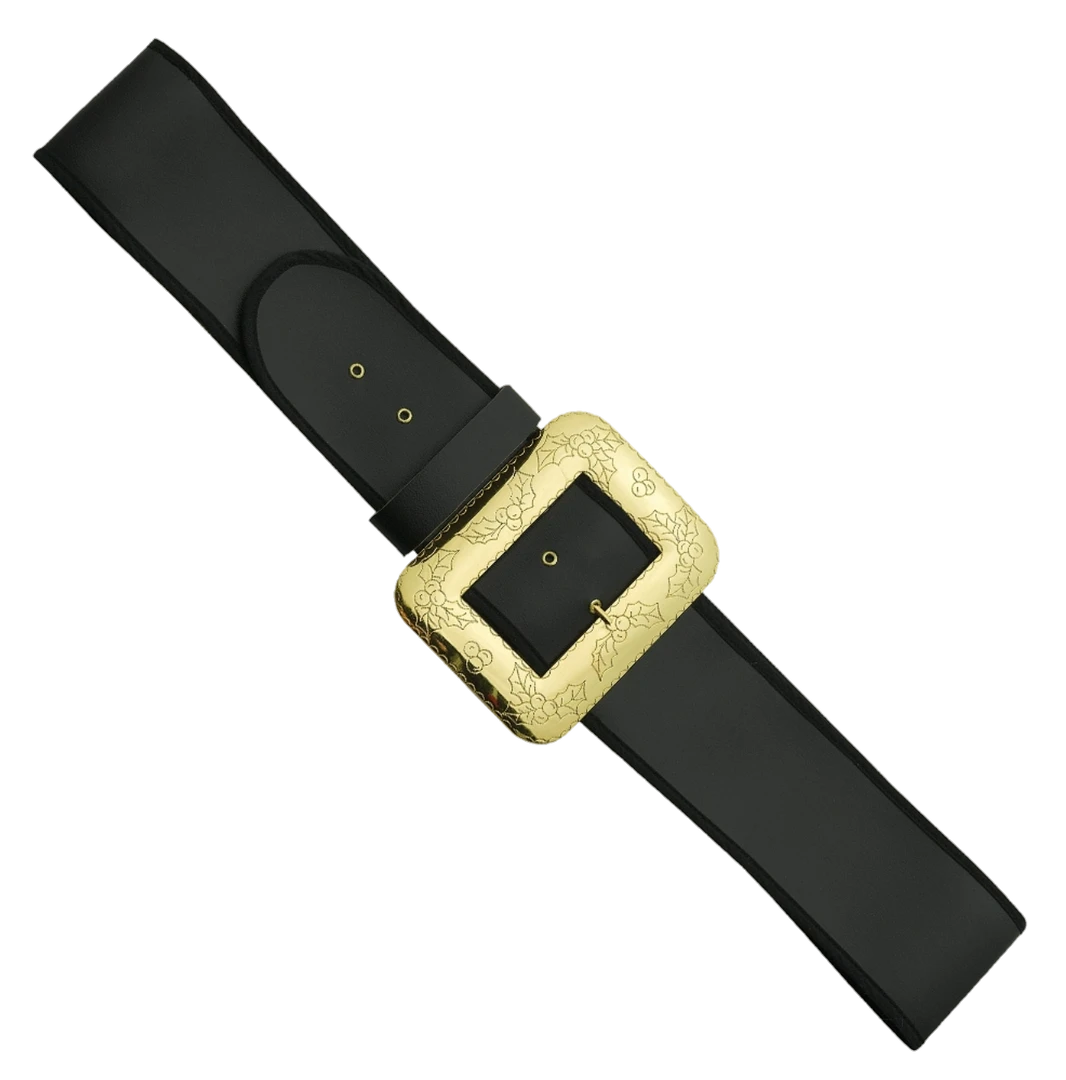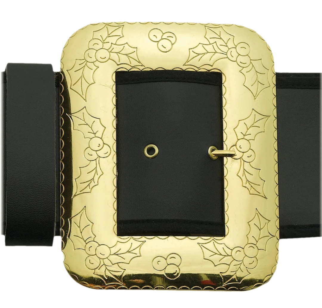 4″ wide black Naugahyde Santa Claus belt with elaborate large cast buckle w/prong, 6 gilt eyelets and belt loop.Â