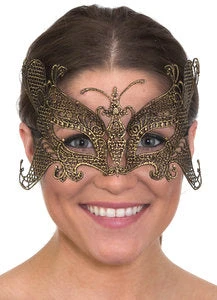 This gold lace butterfly eye mask is made of a gold metallic embroidered lace. Black elastic holds mask in place. One size fits most.Â
