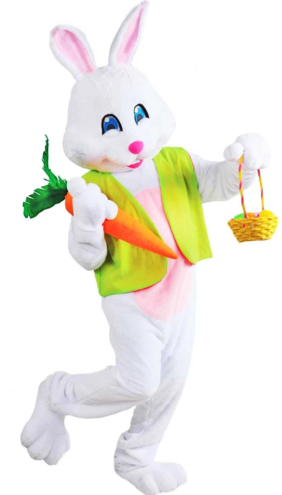 A Professional Quality soft plush Easter Bunny Mascot is an entertaining way to kick-off Spring this Season. Features a Full body back closure Jumpsuit with Soft faux Fur 11-inch Lined Mitts and 14-inch Lined Feet with non-slip soles and back zipper. Reversible Green/ Pink vest makes switching up color schemes Easy. Lightweight Vacuform plastic head with a Comfortable foam rubber headband allows for Natural head Movement. The Male version does not have the eyelashes and removable flower. Long rabbit Ears reach 13 inches tall and contain a wide moldable wire for shaping. Both the fluffy Bunny Tail and fabric flower are detachable. The Soft, stuffed Plush 31-inch Carrot with poseable greenery is a highly recommended accessory included FREE. The inseam length is approximately 31 inches; sleeve length from shoulder seam to the wrist is 29 inches, with the length from the center back to wrist being 39 inches.
