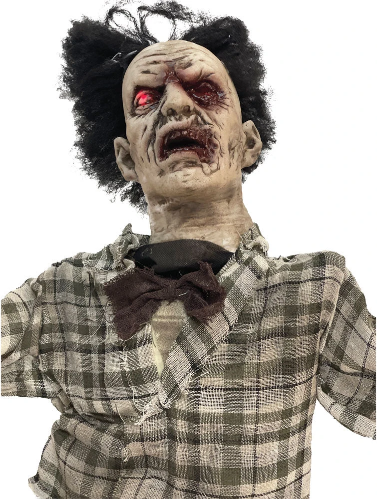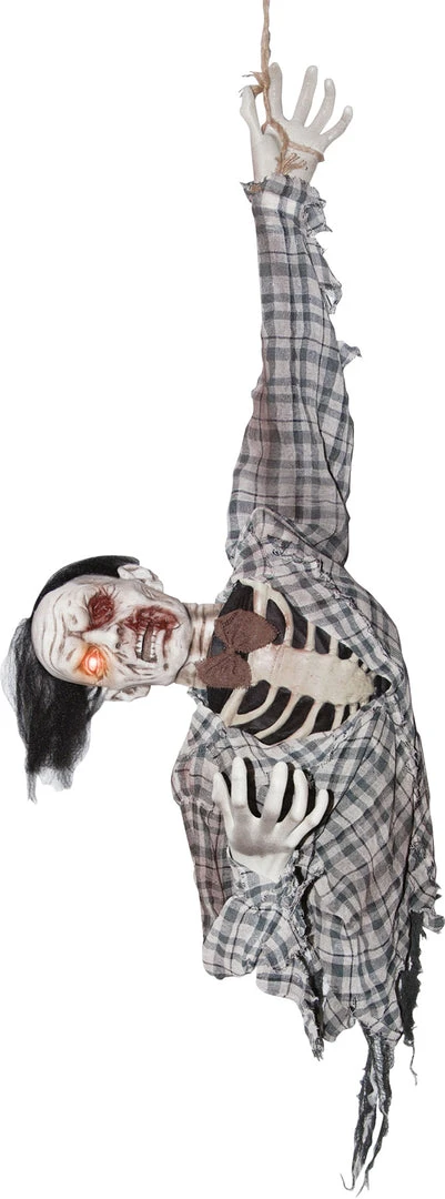 Nothing wrong with having an extra ghoul hanging around and, in this case, this animated ghoul torso will be a great thing for your home haunt or haunted house. Striking look with skull with hair and ghoul wearing shirt and bowtie with ribs exposed! Head and arms move. Uses 4 AA batteries (included). 56.3 x 39.4 x 7.5 inches. Sound activated.