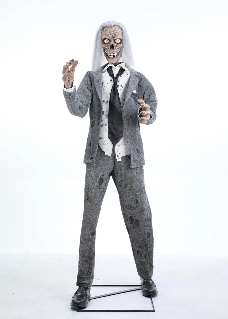 Bring to life your Halloween decorations this season with this 6-foot Servo Ghoul Greeter. This Ghoul Greeter has realistic body and head movement with Servo motor technology! Have a good laugh as his haunting, welcoming sayings invite and “warn” your guests in with style this Halloween. This Ghoul Greeter features LCD Digit eyes, turning head, moving arms and moving jaw.
