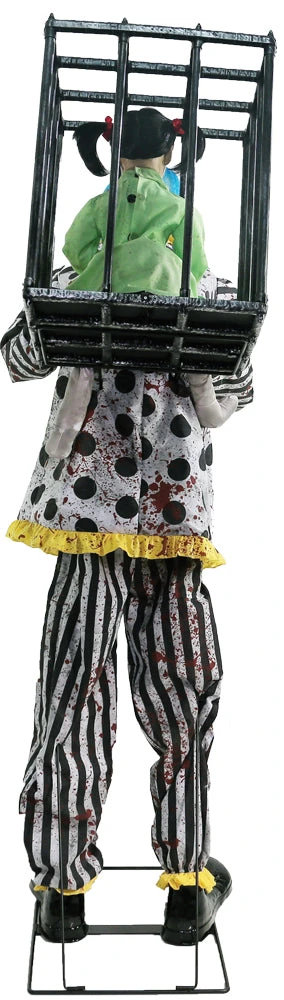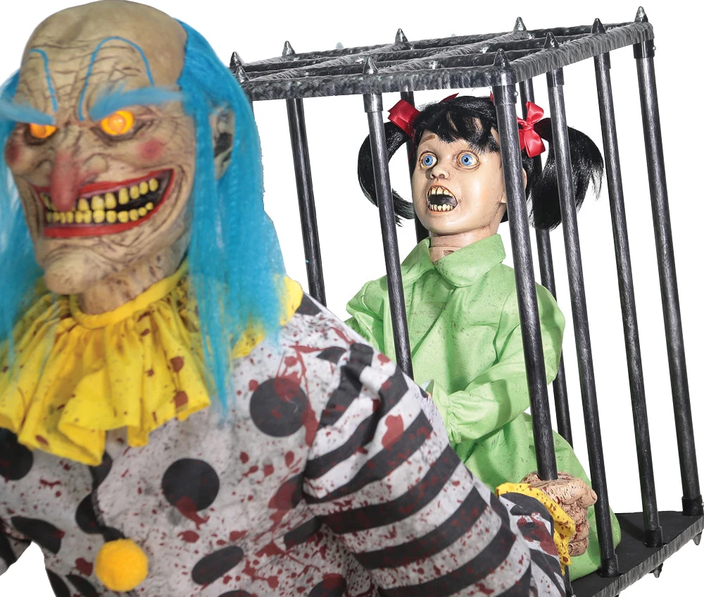 The Mr. Happy Animated Halloween Prop is a life-sized Clown Prop with Lights and Sound! Our Creepy Animated Clown figure is bending over and extending a Large Lollipop in one hand while behind his back he is holding a Large Cage with a Screaming Child inside! His long wispy cotton candy Blue Hair with matching bushy Blue Eyebrows enhance his Glowing Eyes and large Toothy Grin and he wears a dirty old black & white Clown Costume with yellow accents and large Red Clown Shoes. Once activated, Mr. Happy’s Yellow Eyes will Glow and his Head and Torso Turns Side-to-Side while he Speaks one of 5 darkly humorous Sayings as the Captive Child he’s holding in a Cage Screams and Flails about! Easy-to-Assemble quick-connect poles and Convenient Activation Options make this Animated Prop easy to use. Includes Step Here activation pad. Indoor or covered-porch use only. Be the first one in your neighborhood to display this terrifying Mr. Happy Halloween Animated Prop in your next haunted setting!