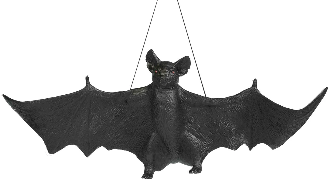 Realistic black bat great for haunted displays and decoration. 22 inches from tip of one wing to tip of other wing.Â