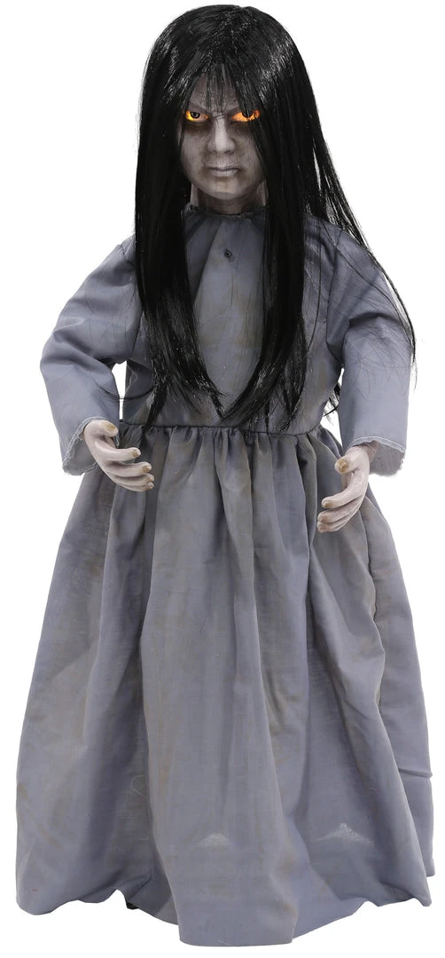 Standing at 32 inches tall this static dreadful doll prop h fade-on/off light-up eyes and says one of three 9-second phrases with each activation of her motion/light sensor (While you stayed away I could tolerate you. Now that you are here you better be afraid! Crows and maggots picked at my flesh not fun. It is an experience I hope to share with you. Your living happiness sickens me. Hell hath no fury like a little girl scorned.) Perfect addition to any haunted house. Easy quick-connect push-button assembly, poseable arms, requires 3 AAA batteries (not included).