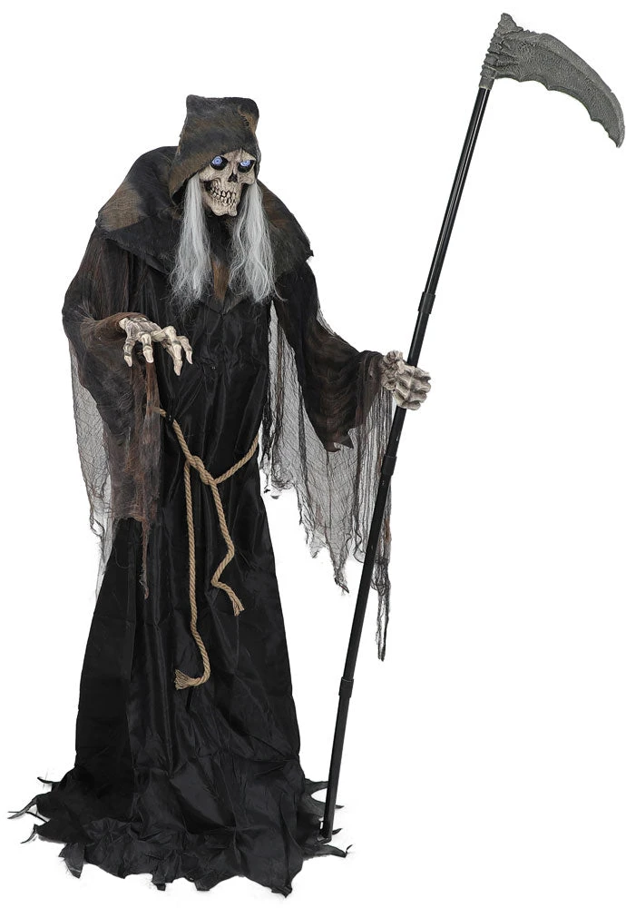 He always knows when your time has come! The 6-foot Lunging Reaper Animated Prop with patented Digiteye technology will add the element of surprise to your next Haunted Scene! His amazing pale eyes appear to look around, and his Mouth Moves as he says 4 scary phrases: