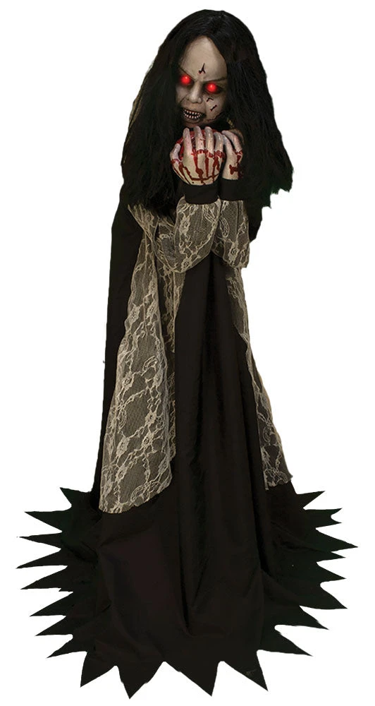The dark Eyes and scarred face of the 50-inch Rosemary (2021 Version) Animated Prop is almost hidden by her long hair. The unearthly demonic child giggles innocently as she gnaws on a brain, showing her Moving Jaw and sharp teeth. An eerie music plays in the background while she munches noisily. Her hands appear to be dripping with blood from her gruesome meal. Then her Eyes start to Glow Red as she Moves her Head Side to Side! Then she suddenly Lunges at you with a Shrill Scream! She laughs at your fear, and returns to her original position giggling all the while. The eyes use LED bulbs, which are energy efficient. Requires 4 AA Batteries, not included. Can also be operated with an adapter, sold separately.Â