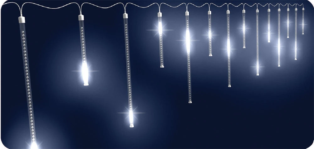 New Shooting Star Icicle Light String simulates dripping icicles with a clear white light and running light motion! These break resistant double-sided 1/2-inch tubes come in alternating lengths of 13.5 inches and 9.5 inches with 4 of each length. Low voltage energy-saving lights have a total of 128 bright LED lights! Good for indoor and outdoor use. Included is a DC 5V/6W transformer and you can connect up to 3 sets of lights with one adapter. There is a 39 inch lead from the adapter with a total lighted length of 7 feet. Great addition to your holiday festivities!