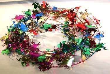 This product can be used to decorate in a number of applications. We make each of the colorful mylar horse and jockeys 1 1/2″  roughly the size of a half-dollar and attach to a flexible, but durable wire wrapped in the same multi-color Mylar.