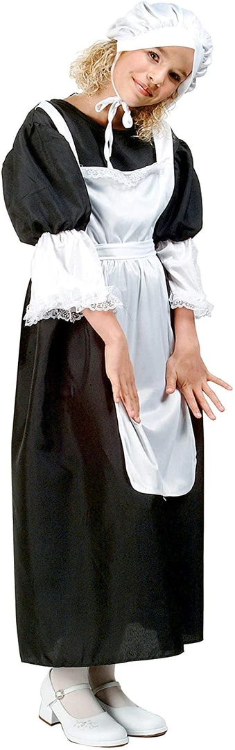 Perfect for school plays, book reports or a Thanksgiving feast! This Pilgrim Girl costume features a blue-grey dress, white apron and matching bonnet.Â