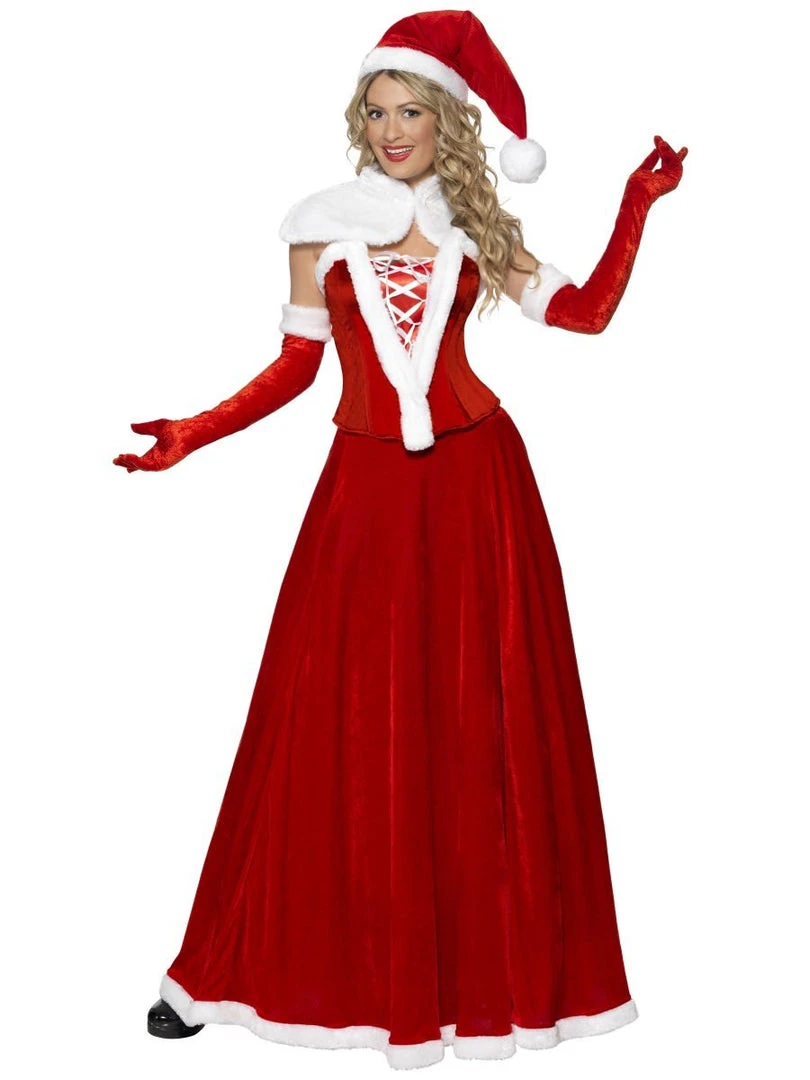 Santa! Find your very own Santa Claus with the Luxury Miss Santa Costume. This female Christmas dress costume includes a hat, cape, corset, skirt and gloves.