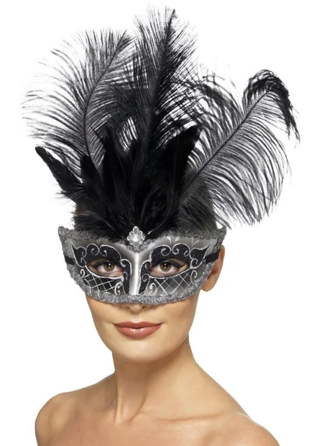 Gorgeous Colombina Style Silver and Black mask trimmed with metallic silver braided ribbon and adorned with glitter. A jewel at the center and a flourish of lush, black plumes adds drama and finishes off the detailing of this mask. Two black satin ribbons attached for ease of wear.Â