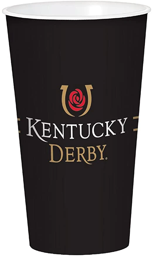 This cup is made of heavy-duty plastic, and it holds 32 ounces of your favorite beverage. The cup is black with a white trim and has a gold horseshoe with a rose in the middle, and underneath is written, “Kentucky Derby”. This would be perfect as a great take-home Derby Party favor.