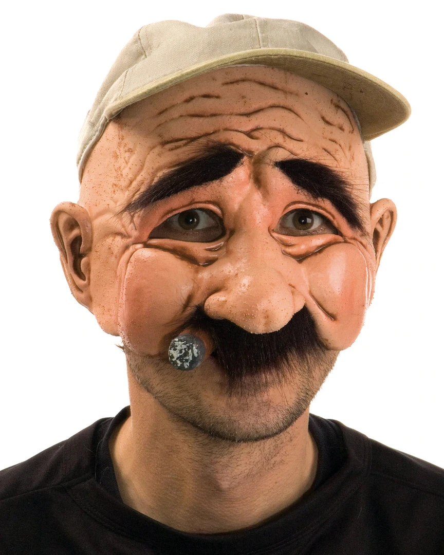 Goofy male character half mask with a cigar and mustache. Includes an attached adjustable baseball cap* that is easy to wear and comfortable.